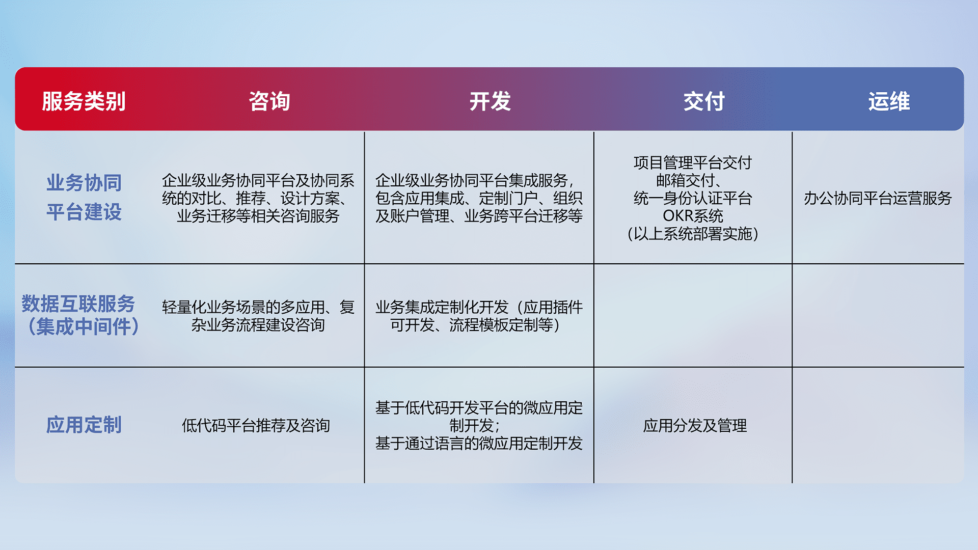 针对钉钉、、企微、、IDaas等平台级产品提供产品的规划、、方案、、、交付、、、定制化开发等服务,,实现如统一协同办公、、、、智能客户服务、、、混合会议管理、、智能数据查询、、、、等业务场景,,,实现数字化转型。。。